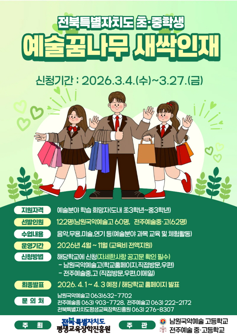 ¿ÃÇØ ¸ðÁý ÀοøÀº ÃÑ 122¸íÀ¸·Î, ÀüÁÖ¿¹¼úÁß¡¤°íµîÇб³¿¡¼ 62¸í, ³²¿ø±¹¾Ç¿¹¼ú°íµîÇб³¿¡¼ 60¸íÀ» °¢°¢ ¼±¹ßÇÑ´Ù. ¼±¹ßµÈ ÇлýµéÀº ¿À´Â 4¿ùºÎÅÍ 9°³¿ù°£ ÁÖ¸» ½Ã°£À» Ȱ¿ëÇØ À½¾Ç, ¹Ì¼ú, ¹«¿ë, ¿¬±â µî Àü°øº° Àü¹® ±³½ÀÀ» ¹Þ°Ô µÈ´Ù