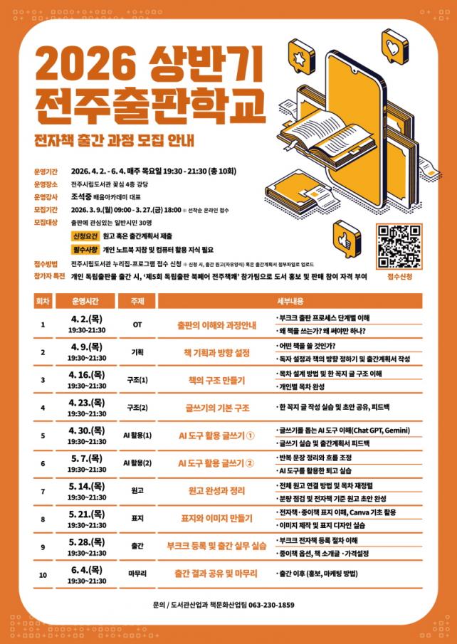 ÀüÁֽô ¿À´Â 9ÀϺÎÅÍ ÀüÁÖµµ¼°ü ´©¸®Áý(lib.jeonju.go.kr)À» ÅëÇØ ¡®2026 ÀüÁÖÃâÆÇÇб³¡¯ »ó¹Ý±â ÇÁ·Î±×·¥ Âü¿©ÀÚ¸¦ ¸ðÁýÇÑ´Ù°í 6ÀÏ ¹àÇû´Ù.