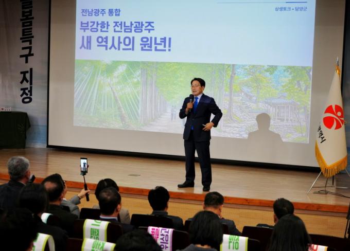 °­±âÁ¤ ±¤ÁÖ½ÃÀåÀº ¡®Àü³²±¤ÁÖÅëÇÕÆ¯º°½Ã ¼³Ä¡¸¦ À§ÇÑ Æ¯º°¹ý¡¯ÀÇ ÁÖ¿ä ³»¿ë°ú 20Á¶¿ø ±Ô¸ðÀÇ Á¤ºÎ ÀçÁ¤ Áö¿øÀÌ °¡Á®¿Ã º¯È­¿¡ ´ëÇØ ¼³¸íÇϰí, ÅëÇÕ ÀÌÈÄ ´ã¾ç±ºÀÇ ¹ßÀüÀü·«À» Á¦½ÃÇß´Ù.