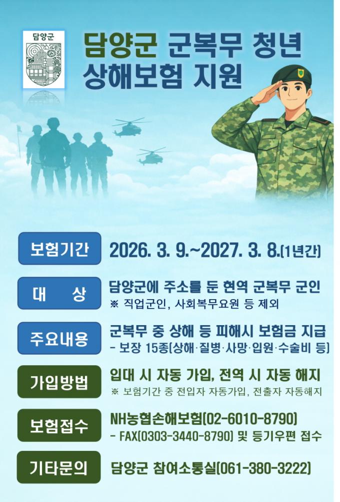 º¸Çè±â°£Àº 2026³â 3¿ù 9ÀϺÎÅÍ 2027³â 3¿ù 8ÀϱîÁöÀ̸ç, Áö¿ø ´ë»óÀº ´ã¾ç±º¿¡ Áֹεî·ÏÀ» µÐ Çö¿ª ±º º¹¹« û³âÀÌ´Ù. ´Ù¸¸ Á÷¾÷±ºÀÎ, »çȸº¹¹«¿ä¿ø, »ê¾÷±â´É¿ä¿ø µîÀº Á¦¿ÜµÈ´Ù.
