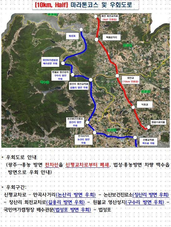 ¾ÈÀüÇÑ ´ëȸ ÁøÇàÀ» À§ÇØ Çà»ç ´çÀÏ 3¿ù 22ÀÏ 10km, Half ÄÚ½º´Â ¿ÀÀü 7½ÃºÎÅÍ ¿ÀÈÄ 12½Ã±îÁö ±¤ÁÖ¿¡¼ ¹ý¼º¡¤È«³ó¹æ¸é »óÇ༱ 2Â÷¼±À» ¿µ±¤À¾ Á¾»ê±³Â÷·ÎºÎÅÍ Â÷¼±À» Á¡Â÷ Ãà¼ÒÇÏ¿© ½ÅÆò±³Â÷·Î¿¡¼´Â Àü¸é ÅëÁ¦µÇ¸ç, 5km ÄÚ½º´Â ¿ÀÀü 7½Ã 30ºÐºÎÅÍ 10½Ã 30ºÐ±îÁö ½ºÆ÷Ƽ¿ò ÈÀü±³Â÷·Î¿¡¼ ¾Æ¸¶ºô·¹ ¾Õ ȸÀü±³Â÷·Î¸¦ Áö³ª ´ÜÁÖ¸® ȸÀü±³Â÷·Î¿¡¼ Å͹̳Π»ç°Å¸®, ´ëÀϳó¾à»ç ¾Õ±îÁö ÀüÂ÷¼±ÀÌ Àü¸é ÅëÁ¦µÇ¸ç, ½ºÆ÷Ƽ¿ò ȸÀü±³Â÷·Î¿¡¼ ´ÜÁÖ¸® ȸÀü±³Â÷·Î ±¸°£Àº ¾ç¹æÇâ Àü¸é ÅëÁ¦µÈ´Ù. ´Ü, ¾Æ¸¶ºô·¹¿Í RPC ¹æ¸éÀ¸·Î ÁøÀÔÇÏ·Á´Â Â÷·®Àº ´ÜÁÖ¸® ȸÀü±³Â÷·Î¿¡¼ ÀϽà Á¤Â÷ ÈÄ Åë°úÇÒ °èȹÀÌ´Ù.