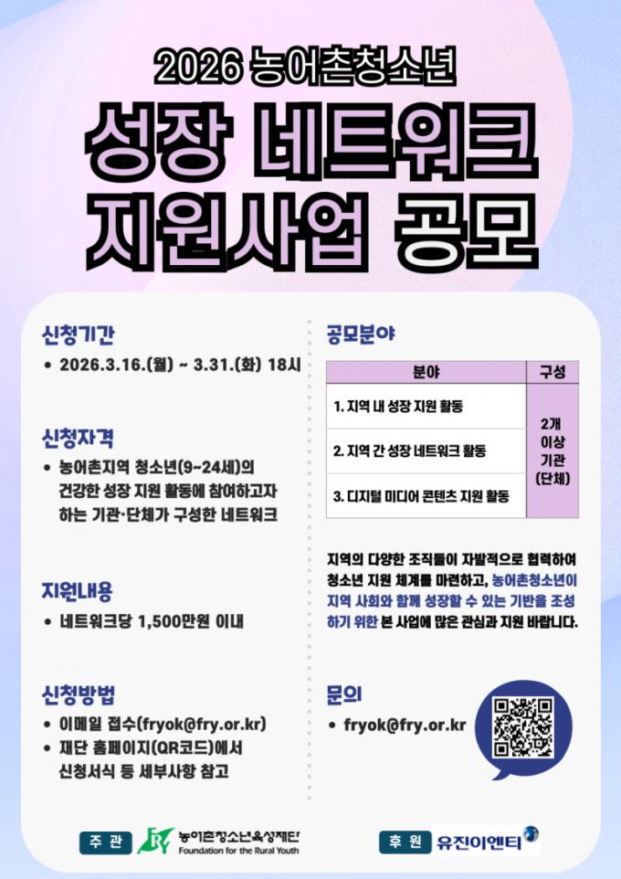 ¡®2026 ³ó¾îÃÌû¼Ò³â ¼ºÀå ³×Æ®¿öÅ© Áö¿ø»ç¾÷¡¯Àº Áö¿ª ³» ´Ù¾çÇÑ ±â°ü°ú ´Üü°¡ ÀÚ¹ßÀûÀ¸·Î Çù·ÂÇÏ¿© û¼Ò³â Áö¿øÃ¼°è¸¦ ±¸ÃàÇϰí, û¼Ò³âÀÌ Áö¿ª»çȸ¿Í ÇÔ²² ¼ºÀåÇÒ ¼ö ÀÖ´Â ±â¹ÝÀ» ¸¶·ÃÇϱâ À§ÇØ ÃßÁøµÇ´Â »ç¾÷ÀÌ´Ù.