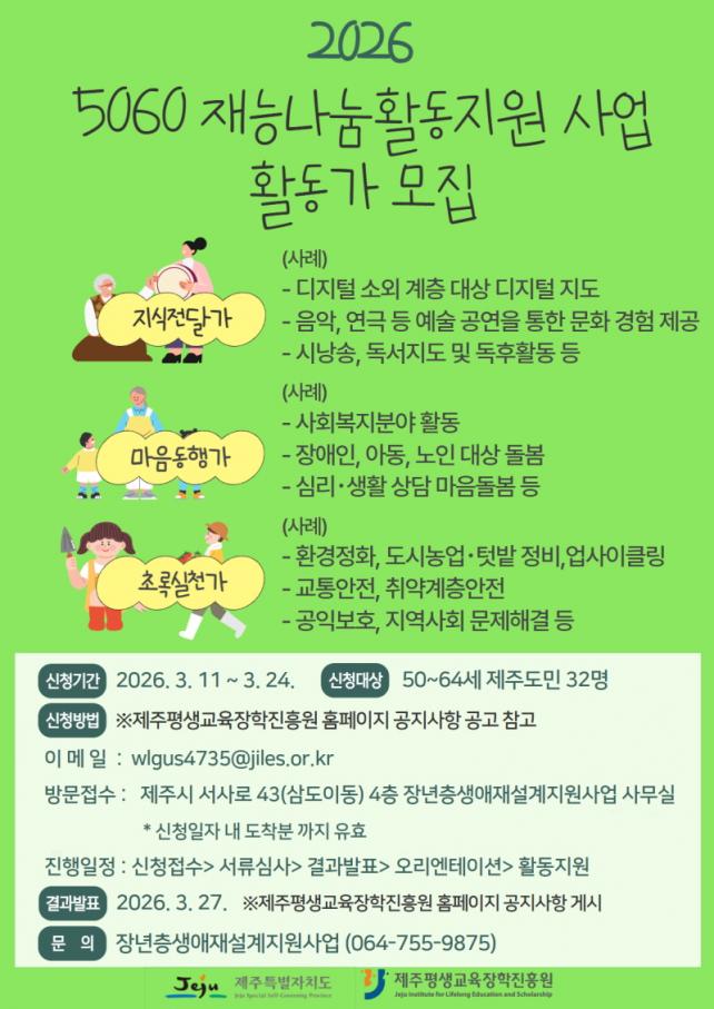 ÃÑ 32¸íÀÇ¡®5060Àç´É³ª´® Ȱµ¿°¡¡¯¸¦ ¸ðÁýÇÒ ¿¹Á¤ÀÌ¸ç ½Åû±â°£Àº 3¿ù 11ÀϺÎÅÍ 3¿ù 24ÀϱîÁöÀÌ´Ù. ½Åû¹æ¹ý ¹× ½Åû¼·ù´Â Á¦ÁÖÆò»ý±³À°ÀåÇÐÁøÈï¿ø ȨÆäÀÌÁö(www.jiles.or.kr) °øÁö»çÇ×(2198¹ø)À» Âü°íÇÏ¸é µÈ´Ù.