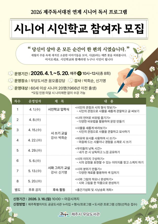 [È£³²µµ¹Î½Å¹® = ÀÓÀ±Áø ±âÀÚ] ¿ì´çµµ¼­°üÀº 2026 Á¦ÁÖµ¶¼­´ëÀü°ú ¿¬°èÇØ ½Ã¹ÎÀÇ »î°ú °æÇèÀ» ¹®ÇÐÀû °¡Ä¡·Î Àç¹ß°ßÇϴ Ưº° ÇÁ·Î±×·¥ÀÎ ¡®½Ã´Ï¾î ½ÃÀÎÇб³¡¯ Âü¿©ÀÚ¸¦ ¸ðÁýÇÑ´Ù.