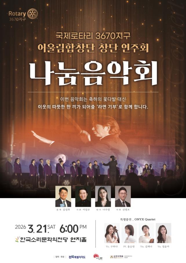 À̹ø À½¾Çȸ´Â ÀÌÀÏ±Ô ÁöÈÖÀÚ¿Í ³ªÁÖ¿µ ¹ÝÁÖÀÚ, ½Å¸í±³ »çȸÀÚ·Î ÁøÇàµÇ¸ç, ÃàÇÏÀÇ ²É´Ù¹ß ´ë½Å ÀÌ¿ô¿¡°Ô µû¶æÇÑ ÇÑ ³¢°¡ µÇ¾îÁÙ ¡®¶ó¸é ±âºÎ¡¯·Î ÇÔ²²ÇÑ´Ù.