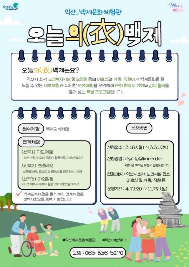 '¿À´ÃÀÇ(ëý) ¹éÁ¦'´Â °í·ÉÃþÀÇ ¹®È ÇâÀ¯ ±âȸ È®´ë¸¦ À§ÇØ ±âȹµÈ üÇè ÇÁ·Î±×·¥À¸·Î, ¹éÁ¦ ¿ª»ç¿Í ¹®È¸¦ ½±°í Áñ°Ì°Ô Á¢ÇÒ ¼ö ÀÖµµ·Ï ¸¶·ÃµÆ´Ù. ½Ã¼³ ÀÌ¿ëÀÚÀÇ °¡Á·°ú ½Ã¼³ Á¾»çÀÚ°¡ ÇÔ²²Çϴ Ȱµ¿À» ÅëÇØ ¼¼´ë °£ °ø°¨°ú Á¤¼Àû ±³·ù¸¦ È®´ëÇÏ´Â µ¥ ¸ñÀûÀÌ ÀÖ´Ù.