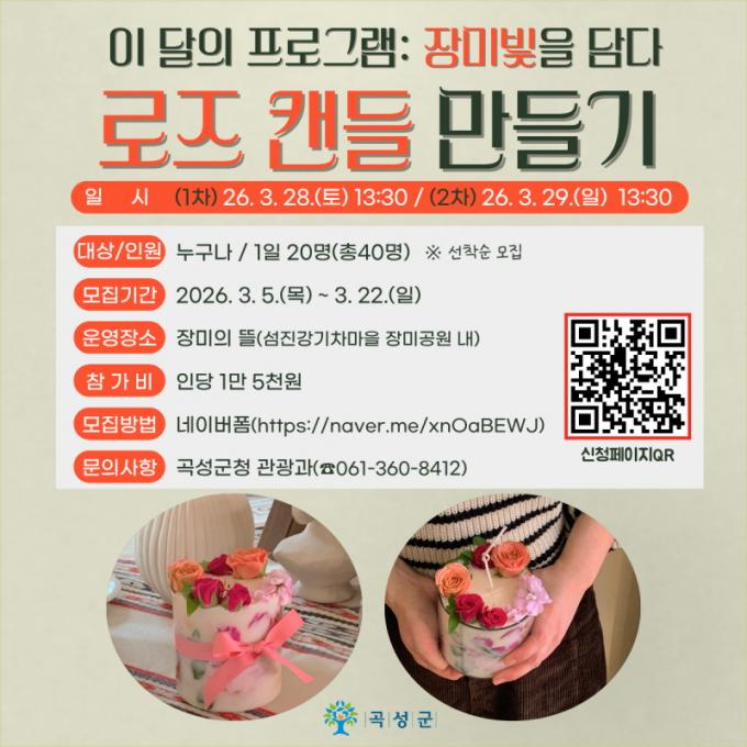 À̹ø ÇÁ·Î±×·¥Àº °î¼º ¼¶Áø°±âÂ÷¸¶À» Àå¹Ì°ø¿ø ³» ¡®Àå¹ÌÀÇ ¶ã¡¯¿¡¼ ÁøÇàµÇ´Â üÇèÇü °ü±¤ Çà»ç·Î, º½À» ¸Â¾Æ Àå¹ÌÀÇ Çâ±â¿Í °¨¼ºÀ» Á÷Á¢ ´ã¾Æº¼ ¼ö ÀÖµµ·Ï ¸¶·ÃµÆ´Ù. ¿î¿µ ½Ã°£Àº ¿ÀÈÄ 1½Ã 30ºÐºÎÅÍÀ̸ç ÇÏ·ç 20¸í¾¿ ÃÑ 40¸íÀ» ¸ðÁýÇÑ´Ù.