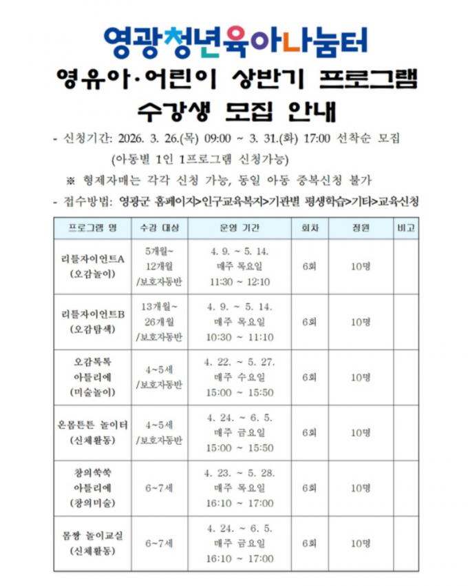 ¿µ±¤Ã»³âÀ°¾Æ³ª´®ÅÍ, 2026³â ¿µÀ¯¾Æ.¾î¸°ÀÌ »ó¹Ý±â ÇÁ·Î±×·¥ ¿î¿µ