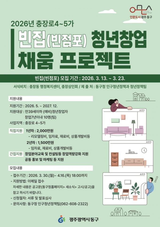 µ¿±¸´Â ÀÌ·¯ÇÑ Á¤Ã¥ÀÇ ÀÏȯÀ¸·Î ÃæÀå·Î 4¡¤5°¡ ÀÏ´ë ºó Á¡Æ÷¸¦ Ȱ¿ëÇÑ ¡®2026³â ºóÁý û³ââ¾÷ ä¿ò ÇÁ·ÎÁ§Æ®¡¯¸¦ º»°Ý ÃßÁøÇÑ´Ù. À̹ø »ç¾÷Àº À¯ÈÞ Á¡Æ÷¸¦ û³â â¾÷°ø°£À¸·Î Àç»ýÇØ Áö¿ª »ó±Ç¿¡ Ȱ·ÂÀ» ºÒ¾î³Ö°í, û³âµé¿¡°Ô´Â ¾ÈÁ¤ÀûÀΠâ¾÷ ±â¹ÝÀ» Á¦°øÇÏ´Â °ÍÀ» ¸ñÇ¥·Î ÇÑ´Ù.