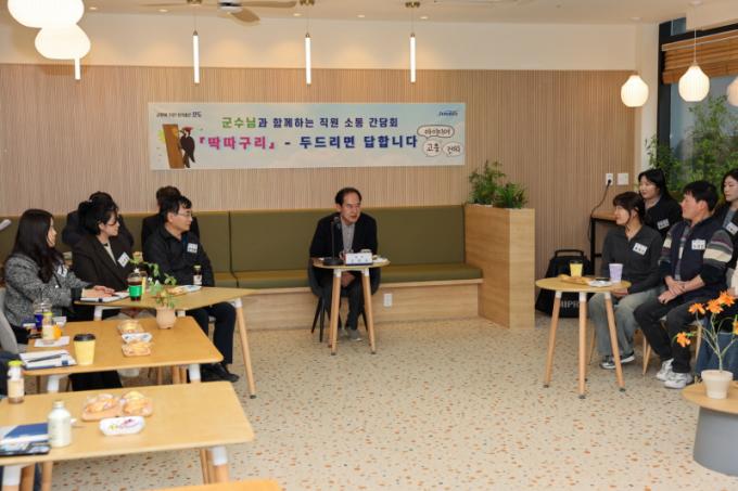 °£´ãȸ´Â Á÷·Äº°·Î 7~9±ÞÀÇ Àú¿¬Â÷ °ø¹«¿øÀ» ´ë»óÀ¸·Î ÁøÇàµÆÀ¸¸ç, Á÷¿øµéÀÌ ±º¼ö¿Í Æí¾ÈÇÑ ºÐÀ§±â ¼Ó¿¡¼ Çã½ÉźȸÇÏ°Ô ÀǰßÀ» ³ª´ ¼ö ÀÖµµ·Ï ¸¶·ÃµÆ´Ù.