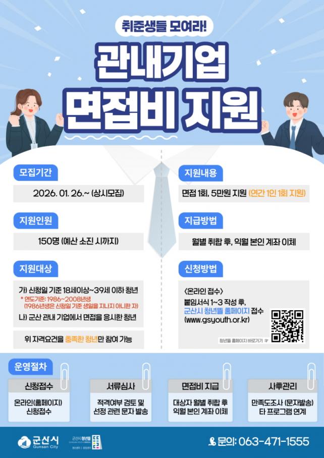 Áö¿ø ´ë»óÀº ±º»ê½Ã ¼ÒÀç »ç¾÷Àå¿¡ ¸éÁ¢À» ÀÀ½ÃÇÑ 18¼¼~39¼¼ ±¸Á÷ û³â 150¸íÀ¸·Î Áö¿ø ±Ý¾×Àº 1ȸ 5¸¸ ¿øÀÌ¸ç ¸¹Àº û³â¿¡°Ô ±âȸ¸¦ Á¦°øÇϱâ À§ÇØ ¿¬°£ 1ȸ¸¸ Áö¿øÇÑ´Ù.