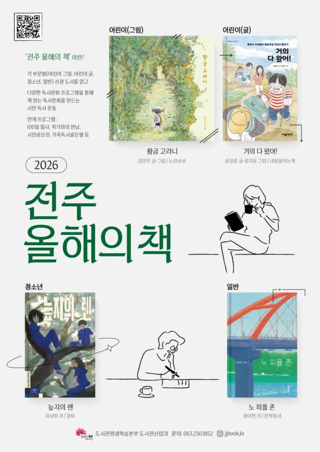 ÀüÁֽô ½Ã¹Îµé°ú ÇÔ²² ÀÐÀ» ¡®2026 ÀüÁÖ ¿ÃÇØÀÇ Ã¥¡¯À¸·Î ¡â¾î¸°ÀÌ(±×¸²) ºÎ¹® Ȳ±Ý °í¶ó´Ï(±è¹Î¿ì ±Û¡¤±×¸², ³ë¶õ»ó»ó) ¡â¾î¸°ÀÌ(±Û) ºÎ¹® °ÅÀÇ ´Ù ¿Ô¾î!(À±ÀÏÈ£ ±Û¡¤Á¤ÁöÀ± ±×¸², ³»ÀÏÀ»¿©´ÂÃ¥) ¡âû¼Ò³â ºÎ¹® ´ËÁöÀÇ ·»(ÃÖ»óÈñ Àú, âºñ) ¡âÀÏ¹Ý ºÎ¹® ³ë ÇÇÇà Á¸(Á¤ÀÌÇö Àú, ¹®Çе¿³×) ÃÑ 4±ÇÀ» ¼±Á¤Çß´Ù°í 19ÀÏ ¹àÇû´Ù.