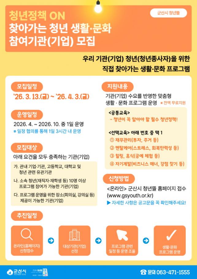 ¸ðÁý ´ë»óÀº ±º»ê½Ã °ü³» ±â°ü(±â¾÷), °íµîÇб³, ´ëÇб³ µîÀ̸ç, ¼Ò¼Ó û³â(ÀçÁ÷ÀÚ ¹× ÀçÇлý) 10¸í ÀÌ»ó Âü¿©°¡ °¡´ÉÇϰí ÇÁ·Î±×·¥ ¿î¿µ Àå¼Ò¸¦ Á¦°øÇÒ ¼ö ÀÖ´Â °÷ÀÌ¸é ½ÅûÇÒ ¼ö ÀÖ´Ù.