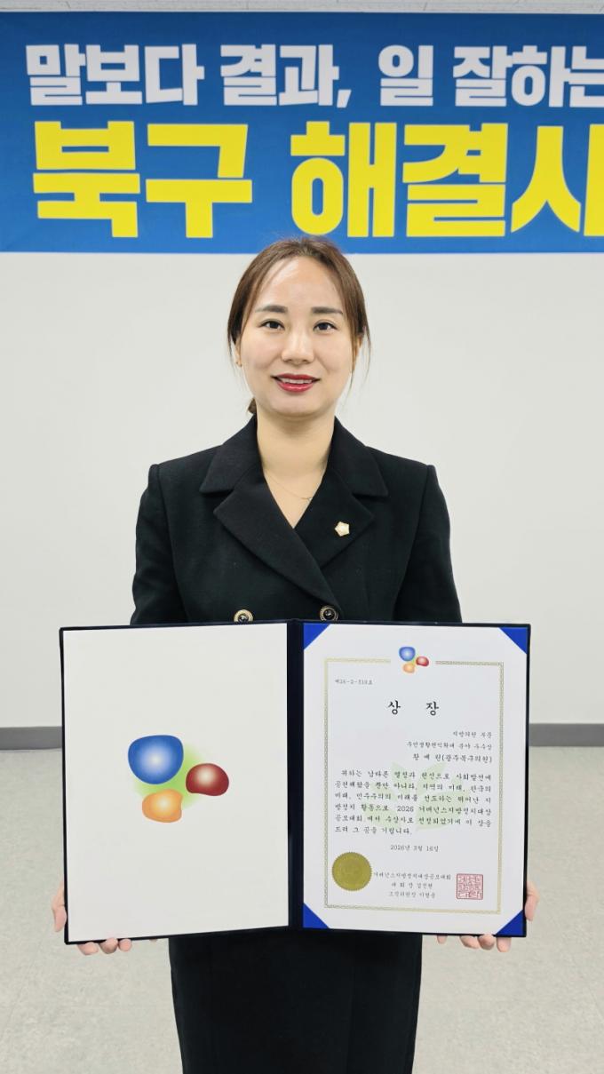 [È£³²µµ¹Î½Å¹® = ÀÓÀ±Áø ±âÀÚ] ±¤ÁÖ±¤¿ª½Ã ºÏ±¸ÀÇȸ Ȳ¿¹¿ø ÀÇ¿ø(¿î¾Ï1¡¤2¡¤3µ¿, µ¿¸²µ¿)ÀÌ Áö³­ 16ÀÏ ±¹È¸µµ¼­°ü °­´ç¿¡¼­ ¿­¸° ¡®2026 °Å¹ö³Í½ºÁö¹æÁ¤Ä¡´ë»ó¡¯ ½Ã»ó½Ä¿¡¼­ Áö¹æÀÇ¿ø ºÎ¹® ¡®ÁֹλýȰÆíÀÍ È®´ë¡¯ ºÐ¾ß ¿ì¼ö»óÀ» ¼ö»óÇß´Ù.