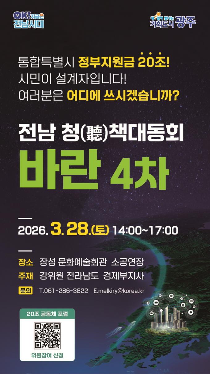 À̹ø ¡®¹Ù¶õ¡¯Àº ¡®20Á¶ ½Ã¹Î°øµ¿Ã¼ Æ÷·³¡¯ÀÇ Ãâ¹ß ½ÅÈ£´Ù. Àü³²µµ´Â Àü³²¡¤±¤ÁÖ ÅëÇÕÆ¯º°½Ã Ãâ¹üÀ» ¾ÕµÎ°í, Á¤ºÎ Áö¿ø 20Á¶ ¿ø ÀçÁ¤ÀÇ È°¿ë ¹æÇâÀ» ½Ã¡¤µµ¹Î°ú ÇÔ²² ³íÀÇÇÏ´Â ¡®20Á¶ ½Ã¹Î°øµ¿Ã¼ Æ÷·³¡¯À» ½ÃÀÛÇÑ´Ù.