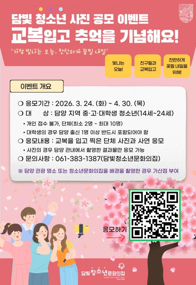 ƯÈ÷, À̹ø °ø¸ðÀüÀº ´ã¾çÀÇ ÀÚ¿¬°ú ¹®È, ±×¸®°í ±³º¹À̶ó´Â ÀÏ»óÀû »ó¡À» ¹è°æÀ¸·Î û¼Ò³âµéÀÇ ÀÏ»óÀ» ±â·ÏÇÏ´Â Áö¿ª Æ¯È ÇÁ·Î±×·¥À¸·Î, Áö¿ª¿¡ ´ëÇÑ °ü½ÉÀ» ³ôÀÌ°í »õ·Î¿î ½Ã¼±À¸·Î ¹Ù¶óº¼ ¼ö ÀÖµµ·Ï ±âȹµÆ´Ù. °ø¸ð ±â°£Àº 3¿ù 24ÀϺÎÅÍ 4¿ù 30ÀÏ ¿ÀÈÄ 6½Ã±îÁöÀ̸ç, ´ã¾ç Áö¿ª Áß¡¤°íµîÇлý ¹× ´ëÇлý(14~24¼¼)ÀÌ Âü¿©ÇÒ ¼ö ÀÖ´Ù.