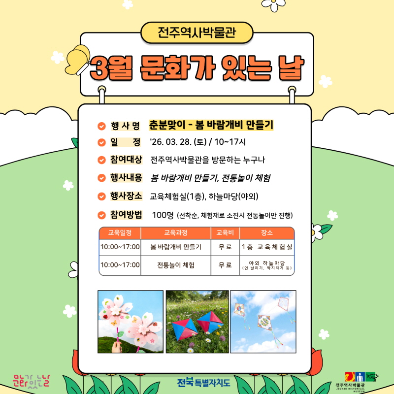 ÀÌ¿Í °ü·Ã ÀüÁÖ¿ª»ç¹Ú¹°°üÀº À̳¯ ÇÁ·Î±×·¥À» ½ÃÀÛÀ¸·Î ¿À´Â 11¿ù±îÁö ¸Å¿ù ¸¶Áö¸· ÁÖ Åä¿äÀÏ¿¡ ¡®¹®È°¡ ÀÖ´Â ³¯¡¯ Çà»ç¸¦ Á¤±âÀûÀ¸·Î ¿î¿µÇÒ °èȹÀÌ´Ù. ÇÁ·Î±×·¥Àº ¹®È üÇèÇü ¸¸µé±â¿Í ¹«·á ¿µÈ »ó¿µ, ÀüÅë³îÀÌ Ã¼Çè µî ´Ùä·Ó°Ô ÁغñµÉ ¿¹Á¤À¸·Î, ÀÚ¼¼ÇÑ »çÇ×Àº ¸Å¿ù 15ÀÏ ÀüÁÖ¿ª»ç¹Ú¹°°ü ´©¸®Áý°ú ÀνºÅ¸±×·¥À» ÅëÇØ °øÁöµÉ ¿¹Á¤ÀÌ´Ù.