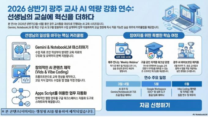 [È£³²µµ¹Î½Å¹® = ÀÓÀ±Áø ±âÀÚ] ±¤Áֽñ³À°Ã»(±³À°°¨ ÀÌÁ¤¼±)Àº ¿À´Â 26ÀϺÎÅÍ ÃÊ¡¤Áß¡¤°í¡¤Æ¯¼öÇб³ ±³¿ø 280¿© ¸íÀ» ´ë»óÀ¸·Î ¡®2026 »ó¹Ý±â »ý¼ºÇü AI ¿ª·® °­È­ ¿¬¼ö¡¯¸¦ ¿î¿µÇÑ´Ù.