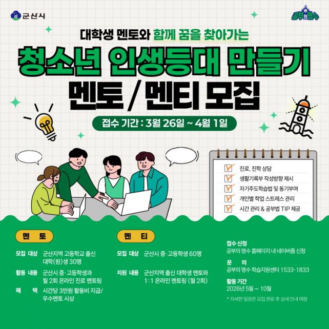 ¡®Ã»¼Ò³â Àλýµî´ë ¸¸µé±â¡¯´Â ±º»ê Áö¿ª °íµîÇб³¸¦ Á¹¾÷ÇÑ ´ëÇлý ¼±¹èµéÀÌ ÈĹèµé¿¡°Ô ´ëÇÐ ÁøÇÐ °æÇè°ú ÇнÀ ³ëÇϿ츦 °øÀ¯Çϰí, ¶Ç·¡¿Í °¡±î¿î ´«³ôÀÌ¿¡¼­ Áø·Î¡¤ÁøÇÐ »ó´ãÀ» Áö¿øÇϱâ À§ÇØ ¸¶·ÃµÈ »ç¾÷ÀÌ´Ù.