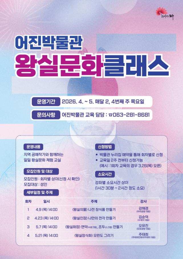 ±³À°Àº ¿À´Â 4¿ù°ú 5¿ù ¸Å¿ù µÑ° ÁÖ¿Í ³Ý° ÁÖ ¸ñ¿äÀÏ ¿ÀÈÄ 2½ÃºÎÅÍ ¿î¿µµÇ¸ç, °»çÁøÀ¸·Î´Â Áö¿ª °ø¿¹ÀÛ°¡µéÀÌ Âü¿©ÇÑ´Ù. ±³À° Âü¿©´Â »çÀü ¿¹¾àÀ» ÅëÇØ °¡´ÉÇϸç, ȸÂ÷º° 2ÁÖ ÀüºÎÅÍ ¾îÁø¹Ú¹°°ü ´©¸®Áý(www.jeonju.go.kr/eojinmuseum) ³» ¿¹¾à ÆäÀÌÁö¿¡¼ Á¢¼öÇÏ¸é µÈ´Ù.