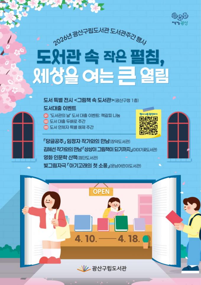 4¿ù 12ÀÏ µµ¼°üÀÇ ³¯ µµ¼ ´ëÃâ Çà»çÀÎ ¡®Ã¥°¥ÇÇ ³ª´®¡¯À» ºñ·ÔÇØ µµ¼°üÁÖ°£ µ¿¾È µµ¼ ´ëÃ⠱Ǽö¸¦ 2¹è·Î È®´ëÇϰí, µµ¼ ¿¬Ã¼ÀÚ Æ¯º° ÇØÁ¦µµ ½ÃÇàµÈ´Ù. µµ¼°üÁÖ°£ Çà»ç¿Í °ü·ÃÇÑ ÀÚ¼¼ÇÑ ÀÏÁ¤°ú Âü¿© ¹æ¹ýÀº ±¤»ê±¸ÅëÇÕµµ¼°ü´©¸®Áý(https://lib.gwangsan.go.kr/main)¿¡¼ È®ÀÎÇÒ ¼ö ÀÖÀ¸¸ç, °ü·Ã ¹®ÀÇ´Â ±¤»ê±¸ ±³À°µµ¼°ü°ú(062-960-3669)·Î ¹®ÀÇÇÏ¸é µÈ´Ù.