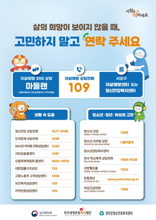 ÇÑÆí, ÁÖº¯¿¡ ¿ì¿ï°¨À¸·Î Èûµé¾îÇϰųª ¸»Çϱ⠾î·Á¿î °í¹ÎÀÌ ÀÖ¾î °íÅë¹Þ´Â °¡Á·¡¤ÁöÀÎÀÌ ÀÖ´Ù¸é Àڻ쿹¹æ »ó´ãÀüÈ(109) ¶Ç´Â Á¤½Å°Ç° À§±â»ó´ãÀüÈ(1577-0199)¸¦ ÅëÇØ 24½Ã°£ Àü¹®°¡ÀÇ »ó´ãÀ» ¹ÞÀ» ¼ö ÀÖ´Ù.