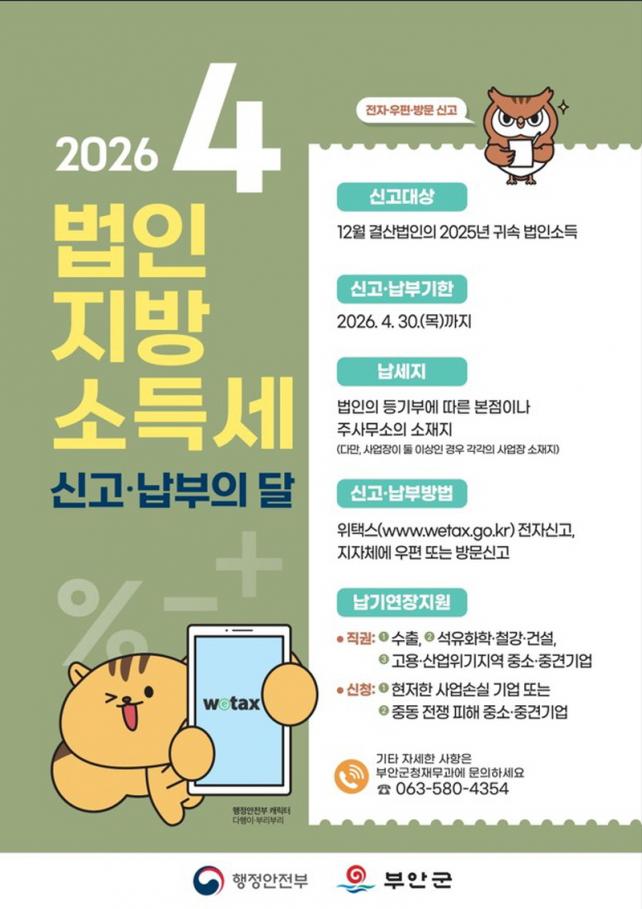 [È£³²µµ¹Î½Å¹® = ÀÓÀ±Áø ±âÀÚ] ºÎ¾È±ºÀº °ü³»¿¡ »ç¾÷ÀåÀ» µÐ 12¿ù °á»ê¹ýÀÎÀ» ´ë»óÀ¸·Î ¿À´Â 4¿ù 1ÀϺÎÅÍ 30ÀϱîÁö 2025³â ±Í¼ÓºÐ ¼Òµæ¿¡ ´ëÇÑ ¡®¹ýÀÎÁö¹æ¼Òµæ¼¼ ÁýÁ߽Űí±â°£¡¯À» ¿î¿µÇÑ´Ù°í ¹àÇû´Ù. ½Å°í ´ë»óÀº 2025³â 12¿ù¿¡ »ç¾÷¿¬µµ°¡ Á¾·áµÈ ¿µ¸®¹ýÀÎ, ¼öÀÍ»ç¾÷À» ¿µÀ§ÇÏ´Â ºñ¿µ¸®¹ýÀÎ, ±¹³» ¿øÃµ ¼ÒµæÀÌ ÀÖ´Â ¿Ü±¹¹ýÀÎ µîÀÌ´Ù. ¼ÒµæÀÌ ¾ø°Å³ª °á¼ÕÀÌ ¹ß»ýÇÑ ¹ýÀεµ ½Å°í Àǹ«°¡ ÀÖ´Ù.