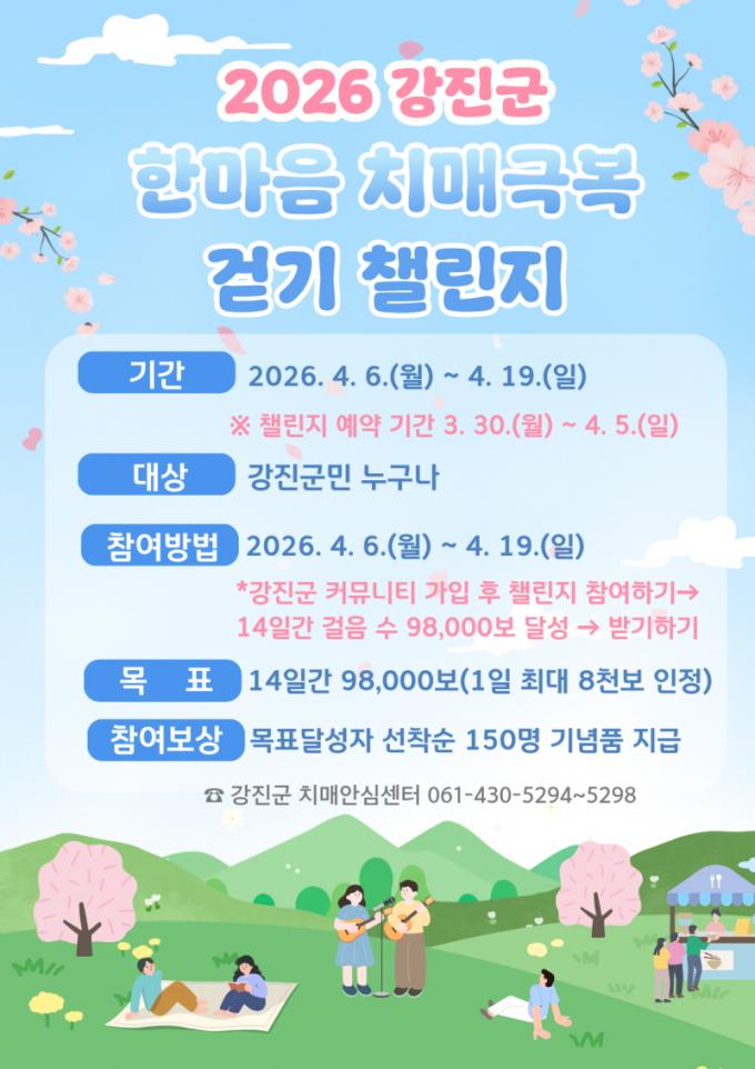 À̹ø 縰Áö ¸ñÇ¥´Â 14ÀÏ µ¿¾È 98,000º¸ ´Þ¼ºÇÏ´Â °ÍÀÌ´Ù. ´Ü ¹«¸®ÇÑ ¿îµ¿À» ¹æÁöÇϱâ À§ÇØ °ÉÀ½ ¼ö´Â 1ÀÏ ÃÖ´ë 8,000º¸±îÁö¸¸ ÀÎÁ¤µÈ´Ù. ¸ñÇ¥ °ÉÀ½ ¼ö¸¦ ´Þ¼ºÇÑ ±º¹Î Áß ¼±Âø¼ø 150¸í¿¡°Ô´Â ¼ÒÁ¤ÀÇ ±â³äǰÀÌ ÁõÁ¤µÈ´Ù. ´ë»óÀÚ´Â 4¿ù 21ÀϺÎÅÍ 4¿ù 30ÀϱîÁö °­Áø±º Ä¡¸Å¾È½É¼¾Å͸¦ Á÷Á¢ ¹æ¹®ÇÏ¿© ±â³äǰÀ» ¼ö·ÉÇÏ¸é µÈ´Ù.