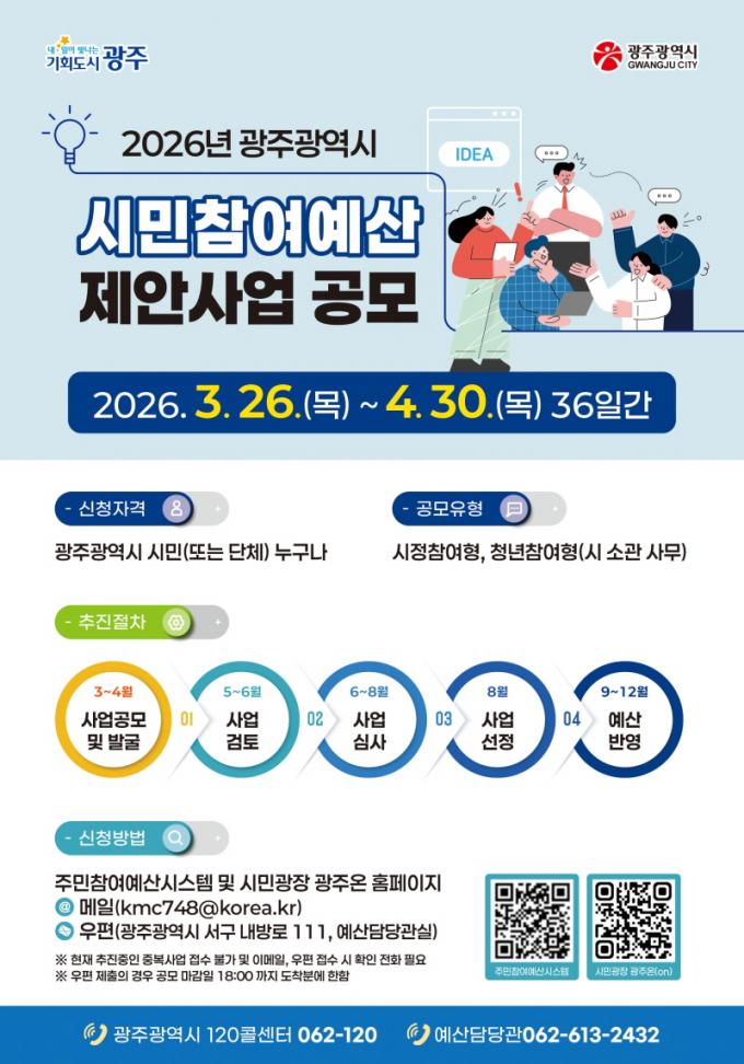 ±¤Áֽô Á¢¼öµÈ Á¦¾È»ç¾÷¿¡ ´ëÇØ ¼Ò°üºÎ¼­ °ËÅä, ½Ã¹ÎÅõÇ¥, ½Ã¹ÎÂü¿©¿¹»êÀ§¿øÈ¸ÀÇ ½ÉÀÇ µîÀ» °ÅÃÄ 2027³â ¿¹»ê¾È¿¡ ¹Ý¿µÇÒ ¿¹Á¤ÀÌ´Ù. ÀÌÈÄ ±¤ÁÖ½ÃÀÇȸ ½ÂÀÎÀ» ¹ÞÀ¸¸é »ç¾÷ÀÌ ÃÖÁ¾ È®Á¤µÈ´Ù.
