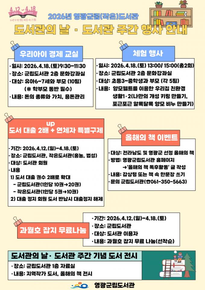 ¡®µµ¼­°ü ¼Ó ÀÛÀº Æîħ, ¼¼»óÀ» ¿©´Â Å« ¿­¸²¡¯À̶õ ÁÖÁ¦·Î ±º¹ÎµéÀÇ Âü¿©¸¦ È®´ëÇϰí, µµ¼­°üÀÇ °ø°øÀû °¡Ä¡¿Í ¿ªÇÒ¿¡ ´ëÇÑ ÀνÄÀ» ³ôÀ̱â À§ÇØ ¸¶·ÃµÈ µµ¼­°ü ÁÖ°£ üÇè ÇÁ·Î±×·¥ ¡ãÀ¯¾Æ¿Í ºÎ¸ð ´ë»ó ¡®¿ì¸® ¾ÆÀÌ °æÁ¦ ±³½Ç(6~7¼¼)¡¯ ¡ã¡®¾ç¸ðÆçÆ®¸¦ ÀÌ¿ëÇÑ ¿ì¸®Áý ģȯ°æ »ýȰ¡¯ ¿Ü ¡ãÁö¿ªÀÛ°¡ µµ¼­ Àü½Ã ¡ã¿ÃÇØÀÇ Ã¥ °¨»óÆò À̺¥Æ®¸¦ ÁøÇàÇÑ´Ù.