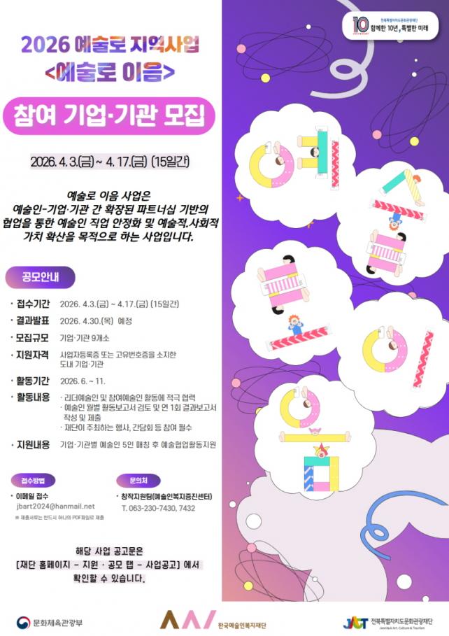 ¿¹¼ú·Î Áö¿ª»ç¾÷(¿¹¼ú·ÎÀÌÀ½)Àº ¹®ÈüÀ°°ü±¤ºÎ¿Í Çѱ¹¿¹¼úÀκ¹ÁöÀç´ÜÀÌ ÁÖÃÖÇϸç, Àç´ÜÀÌ ¿î¿µ±â°ü °ø¸ð¿¡ ¼±Á¤µÅ ÃßÁøÇÏ´Â »ç¾÷ÀÌ´Ù. ±â¾÷¡¤±â°ü¡¤¿¹¼úÀÎ °£ È®ÀåµÈ ÆÄÆ®³Ê½Ê ±â¹ÝÀÇ Çù¾÷À» ÅëÇÑ ¿¹¼úÀÎ Á÷¾÷ ¾ÈÁ¤È ¹× ¿¹¼úÀû¡¤»çȸÀû °¡Ä¡ È®»êÀ» ¸ñÀûÀ¸·Î ÇÑ´Ù.
