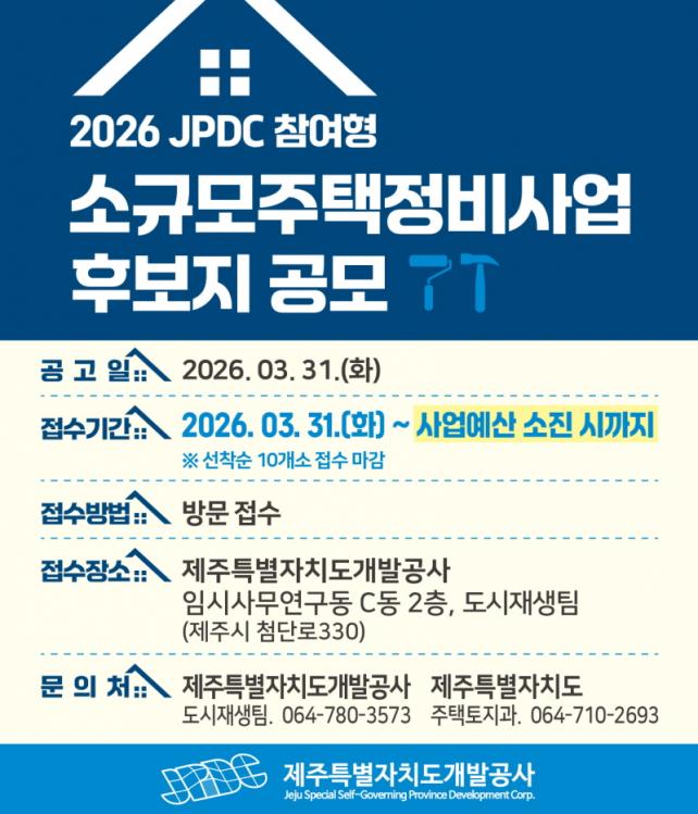 ¡®JPDCÂü¿©Çü ¼Ò±Ô¸ðÁÖÅÃÁ¤ºñ»ç¾÷ Èĺ¸Áö ¹ß±¼ °ø¸ð¡¯¿¡ ´ëÇÑ ÀÚ¼¼ÇÑ »çÇ×Àº Á¦ÁÖ°³¹ß°ø»ç ȨÆäÀÌÁö(https://www.jpdc.co.kr) ³» °øÁö»çÇ׿¡¼ È®ÀÎÇÒ ¼ö ÀÖ´Ù.