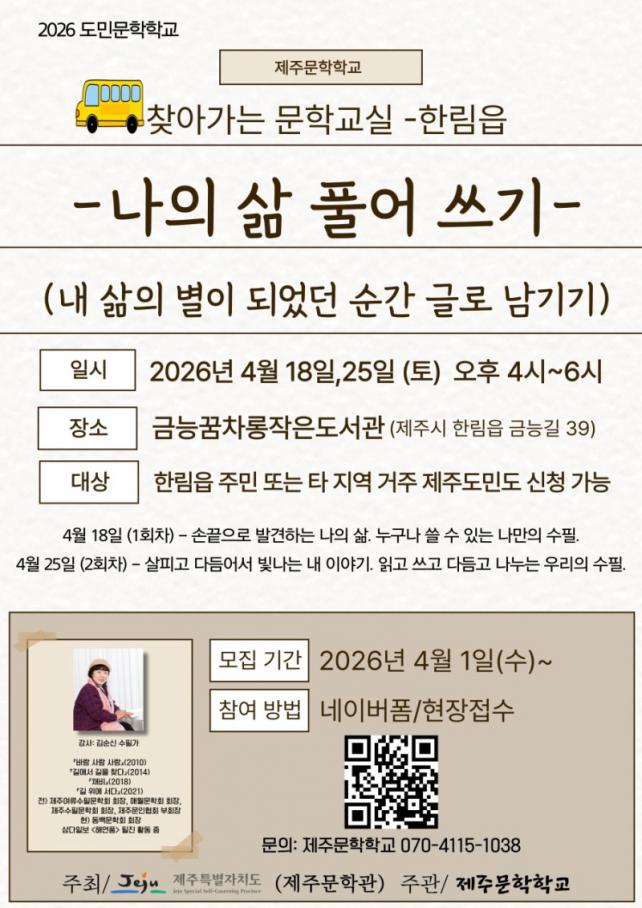 Á¦ÁÖ¹®ÇÐÇб³ °ü°èÀÚ´Â ¡°Ã£¾Æ°¡´Â ¹®Çб³½ÇÀº Áö¿ª ÁֹεéÀÌ »ýȰ ¼Ó¿¡¼ ¹®ÇÐÀ» °æÇèÇÒ ¼ö ÀÖµµ·Ï ±âȹµÈ ÇÁ·Î±×·¥¡±À̶ó¸ç ¡°±Û¾²±â¸¦ óÀ½ ½ÃÀÛÇÏ´Â ºÐµéµµ ºÎ´ã ¾øÀÌ Âü¿©ÇØ ÀÚ½ÅÀÇ À̾߱⸦ Ç®¾î³¾ ¼ö ÀÖ´Â °è±â°¡ µÇ±æ ¹Ù¶õ´Ù¡±°í ¸»Çß´Ù.