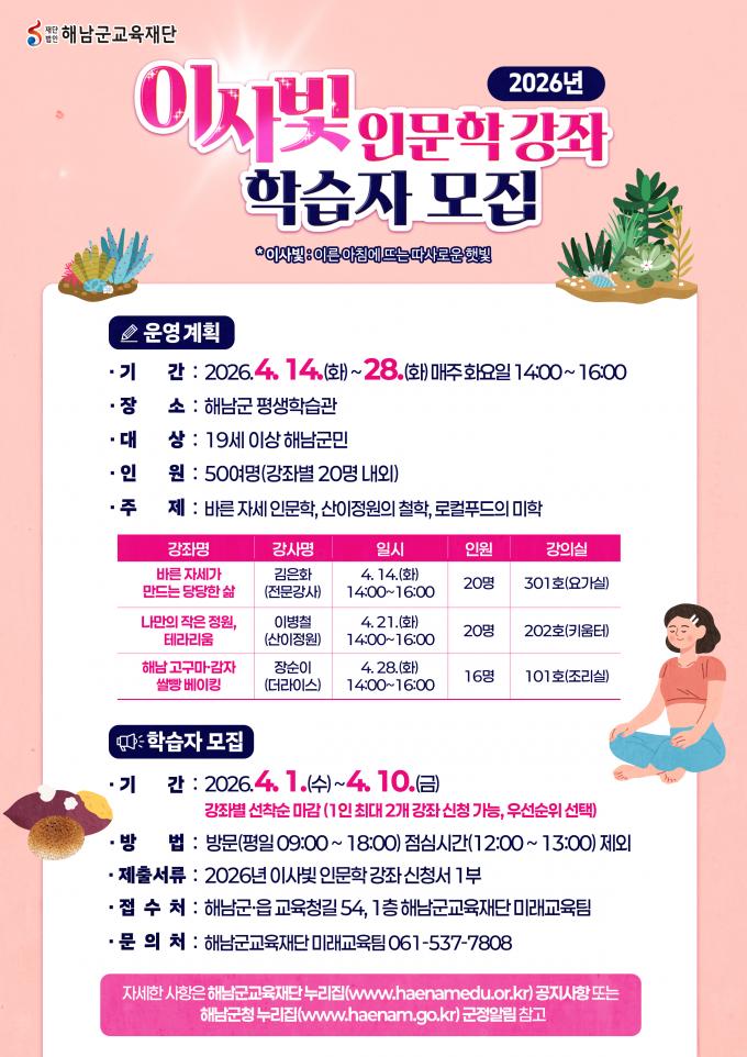 [È£³²µµ¹Î½Å¹® = ÀÓÀ±Áø ±âÀÚ] ÇØ³²±º±³À°Àç´ÜÀº 4¿ù 14ÀϺÎÅÍ 28ÀϱîÁö¡®Çس² ÀÌ»çºû Àι®ÇÐ °­Á¡¯¸¦ ¿î¿µÇÑ´Ù. ¡®ÀÌ»çºû¡¯Àº ¡®À̸¥ ¾ÆÄ§ µû½ºÇÏ°Ô ºñÃß´Â ÇÞºû¡¯À» ÀǹÌÇÏ¸ç µû¶æÇϰí Ä£±ÙÇÑ Àι®ÇÐÀÇ ºûÀ» ÀüÇÏ´Â ±º¹Î ±³À°°úÁ¤ÀÌ´Ù.