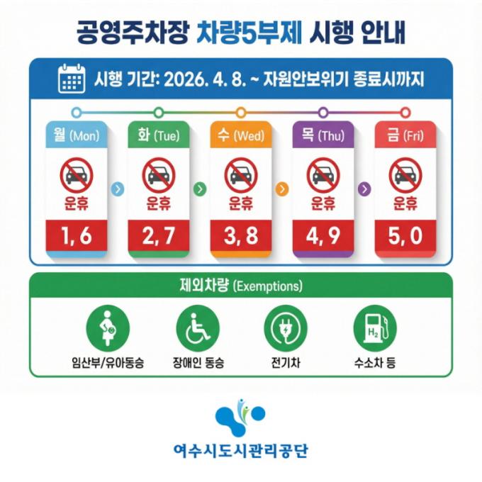 [È£³²µµ¹Î½Å¹® = ÀÓÀ±Áø ±âÀÚ] ¿©¼ö½Ãµµ½Ã°ü¸®°ø´Ü(ÀÌ»çÀå ¼Ûº´±¸)Àº ÃÖ±Ù Áßµ¿ »çÅ·ΠÀÎÇÑ ÀÚ¿ø¾Èº¸ À§±â ¡®°æ°è¡¯ ´Ü°è ¹ß·É¿¡ µû¶ó, ¿À´Â 4¿ù 8ÀϺÎÅÍ ÀÚ¿ø¾Èº¸ À§±â °æº¸ ÇØÁ¦ ½Ã±îÁö °ü³» °ø¿µÁÖÂ÷ÀåÀ» ´ë»óÀ¸·Î ¡®Â÷·® 5ºÎÁ¦¡¯¸¦ ¹Î°£ ºÎ¹®±îÁö È®´ë ½ÃÇàÇÑ´Ù°í ¹àÇû´Ù.