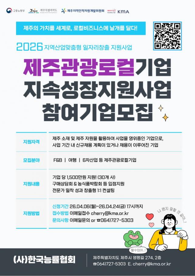 À̹ø »ç¾÷Àº Á¦ÁÖÀÇ À¯¡¤¹«Çü Áö¿ª ÀÚ¿øÀ» Ȱ¿ëÇØ µ¶Ã¢ÀûÀÎ ºñÁî´Ï½º ¸ðµ¨À» ¿î¿µ ÁßÀÎ F&B, ¿©Çà, 6Â÷ »ê¾÷ ºÐ¾ß µîÀÇ °ü±¤·ÎÄñâ¾÷À» ´ë»óÀ¸·Î ÇÑ´Ù. KMA´Â ÃÑ 30°³ ³»¿ÜÀÇ ±â¾÷À» ¼±Á¤ÇÏ¿© ±â¾÷ ´ç 1,500¸¸¿ø ±Ô¸ðÀÇ »ç¾÷È ÀÚ±ÝÀ» Áö¿øÇÒ °èȹÀÌ´Ù.
