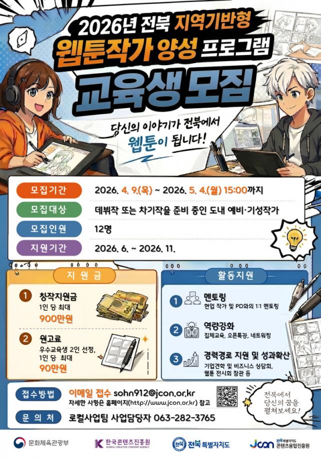 ½Åû Á¢¼ö´Â 4¿ù 9ÀϺÎÅÍ 5¿ù 4ÀÏ ¿ÀÈÄ 3½Ã±îÁö ÁøÇàµÇ¸ç, Áö¿ø Èñ¸ÁÀÚ´Â ½Åû¼¿Í ÀÛǰ±âȹ¼, Æ÷Æ®Æú¸®¿À µîÀ» À̸ÞÀÏ·Î Á¦ÃâÇÏ¸é µÈ´Ù. ÀÚ¼¼ÇÑ »çÇ×Àº ÀüºÏÄÜÅÙÃ÷À¶ÇÕÁøÈï¿ø ´©¸®Áý(www.jcon.or.kr)¿¡¼ È®ÀÎÇÒ ¼ö ÀÖ´Ù.