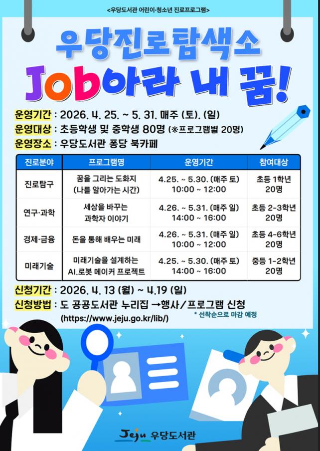 Âü°¡ ½ÅûÀº ¿À´Â 4¿ù 13ÀϺÎÅÍ 4¿ù 19ÀϱîÁö Á¦ÁÖÆ¯º°ÀÚÄ¡µµ °ø°øµµ¼°ü ´©¸®Áý(https://www.jeju.go.kr/lib)À» ÅëÇØ ¿Â¶óÀÎÀ¸·Î Á¢¼öÇÏ¸é µÈ´Ù. ¸ðÁý ÀοøÀº °úÁ¤º° 20¸í¾¿ ¼±Âø¼øÀ¸·Î ¸¶°¨µÈ´Ù.