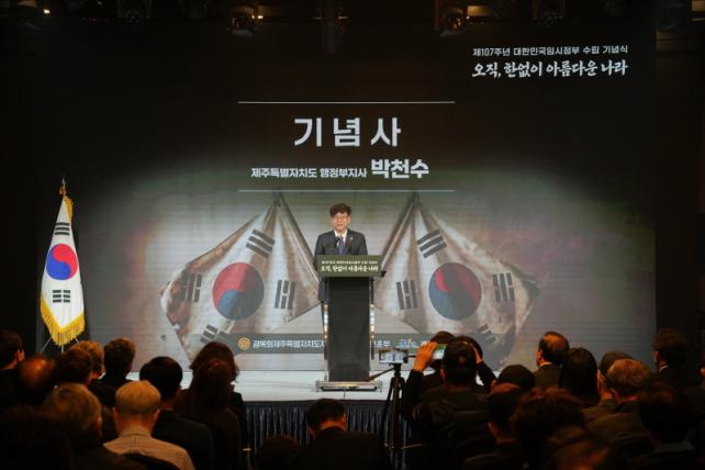 ¹Úõ¼ö µµÁö»ç ±ÇÇÑ´ëÇàÀº¡°´ëÇѹα¹ ÀÓ½ÃÁ¤ºÎÀÇ ¹ýÅë°ú ¼±¿µéÀÇ µ¶¸³ Á¤½ÅÀº ¿À´Ã³¯ ´ëÇѹα¹ÀÇ ÀÚÀ¯¿Í ¹ÎÁÖÁÖÀǸ¦ ¶°¹ÞÄ¡´Â ±Ù°£¡±À̶ó¸ç,¡°±× Á¤½ÅÀº Áö³ÇØ µµ¹Î°ú ÇÔ²² ¼±Æ÷ÇÑ ¡®Á¦ÁÖÆòÈÀαÇÇåÀ塯¿¡µµ À̾îÁ® ÀÖ´Ù¡±°í ¸»Çß´Ù. ÀÌ¾î ¡°Á¦ÁÖµµ´Â ÇåÀåÀÇ °¡Ä¡¸¦ ¹ÙÅÁÀ¸·Î ¡®¼¼°èÆòÈÀÇ ¼¶¡¯ÀÇ ¿ªÇÒÀ» ´õ¿í °ÈÇϰí, ±¹°¡À¯°øÀÚ¿Í À¯°¡Á·¿¡ ´ëÇÑ Á¸°æ°ú ¿¹¿ì¿¡µµ ÃÖ¼±À» ´ÙÇϰڴ١±°í °Á¶Çß´Ù.