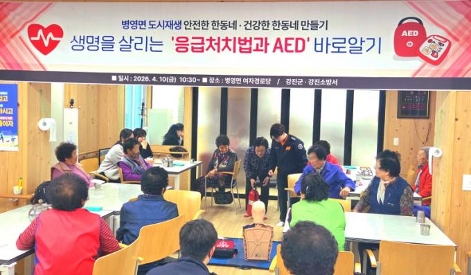 °Áø±ºÀÌ Áö³ 10ÀÏ, º´¿µ¸é ¿©ÀÚ°æ·Î´ç(Ä¿¹Â´ÏƼÄÉ¾î »ç¶û¹æ)¿¡¼ 30¿© ¸íÀÇ ¾î¸£½Å°ú Àα٠ÁֹεéÀ» ´ë»óÀ¸·Î ÀÚµ¿½ÉÀåÃæ°Ý±â(AED) »ç¿ë¹ý ±³À°À» ½Ç½ÃÇß´Ù.