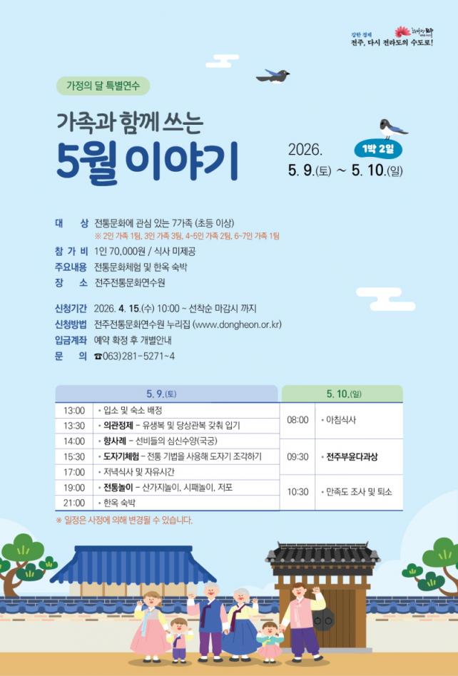 À̹ø Ưº°¿¬¼ö´Â 1¹Ú 2ÀÏ(5¿ù 9ÀÏ~10ÀÏ)°£ ÁøÇàµÇ¸ç, ¡â¼±ºñ º¹ÀåÀ» °®Ãç ÀÔ°í ÁøÇàÇÏ´Â ¡®Çâ»ç·Ê(úÁÞÒÖÉ/±¹±Ã) üÇ衯 ¡âÀüÅë ±â¹ýÀ» Ȱ¿ëÇØ µµÀڱ⸦ Á¶°¢ÇØ º¸´Â ¡®µµÀÚ±â üÇ衯 ¡âÀü¹® °»ç¿Í ÇÔ²² ¿ì¸® ¹ÎÁ·ÀÇ ³îÀ̸¦ Áñ°Üº¸´Â ¡®ÀüÅë ³îÀÌ Ã¼Ç衯 ¡âÂ÷ ¸¶½Ã´Â ¿¹¹ýÀ» ¹è¿ì¸ç ÀüÅëÂ÷(Òþ)¸¦ ¸Àº¼ ¼ö ÀÖ´Â ¡®ÀüÁÖºÎÀ± ´Ù°ú»ó¡¯ µî ´Ù¾çÇÑ ÀüÅ빮ȸ¦ Áñ±æ ¼ö ÀÖµµ·Ï ±¸¼ºµÆ´Ù.