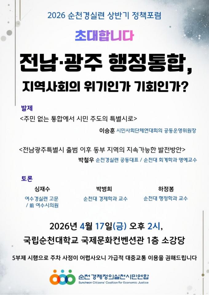 ¼øÃµ°æ½Ç·ÃÀº ¡°ÃÖ±Ù ³íÀǵǰí ÀÖ´Â Àü³²¡¤±¤ÁÖ ÇàÁ¤ÅëÇÕÀº Áö¿ª»çȸÀÇ ¹Ì·¡¸¦ °áÁ¤ ÁöÀ» Áß´ëÇÑ »ç¾ÈÀÓ¿¡µµ ºÒ±¸Çϰí, ½Ã¡¤µµ¹ÎÀÇ ÃæºÐÇÑ °ø°¨´ë Çü¼ºÀ̳ª ¼÷ÀÇ °úÁ¤ ¾øÀÌ ÇÏÇâ½ÄÀ¸·Î ÃßÁøµÇ°í ÀÖ´Ù´Â ¿ì·Á°¡ Á¦±âµÇ°í ÀÖ´Ù¸ç, ƯÈ÷ Àü³² µ¿ºÎ±ÇÀÇ ÇàÁ¤Àû, °æÁ¦Àû ¼Ò¿Ü Çö»óÀÌ ½É鵃 ¼ö ÀÖ´Ù´Â ½Ã¹ÎµéÀÇ ºÒ¾È°¨ÀÌ Ä¿Áö°í ÀÖ¾î ÇâÈÄ Áö¿ª»çȸ ´ëÀÀ ¹æÇâÀ» ¸ð»öÇϱâ À§ÇØ À̹ø Æ÷·³À» ÁغñÇß´Ù¡±°í ¹àÇû´Ù.
