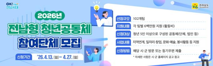 [È£³²µµ¹Î½Å¹® = ÀÓÀ±Áø ±âÀÚ] Àü¶ó³²µµ°¡ û³âÀÇ Áö¿ª Á¤Âø°ú Ȱµ¿ ±â¹Ý ¸¶·ÃÀ» À§ÇØ ¡®2026 Àü³²Çü û³â°øµ¿Ã¼ Ȱ¼ºÈ­ »ç¾÷¡¯¿¡ Âü¿©ÇÒ 102°³ ÆÀÀ» ¸ðÁýÇÑ´Ù.