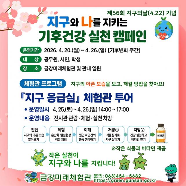 [È£³²µµ¹Î½Å¹® = ÀÓÀ±Áø ±âÀÚ] ±º»ê½Ã´Â Á¦56ȸ Áö±¸ÀÇ ³¯(4¿ù 22ÀÏ)°ú ±âÈĺ¯È­ÁÖ°£À» ¸Â¾Æ ½Ã¹ÎµéÀÇ ±âÈÄÀ§±â ´ëÀÀ Âü¿©¸¦ À¯µµÇϱâ À§ÇØ 4¿ù 20ÀϺÎÅÍ 26ÀϱîÁö ¡®Áö±¸¿Í ³ª¸¦ ÁöŰ´Â ±âÈİǰ­ ½Çõ Ä·ÆäÀΡ¯À» ¿î¿µÇÑ´Ù°í ¹àÇû´Ù.