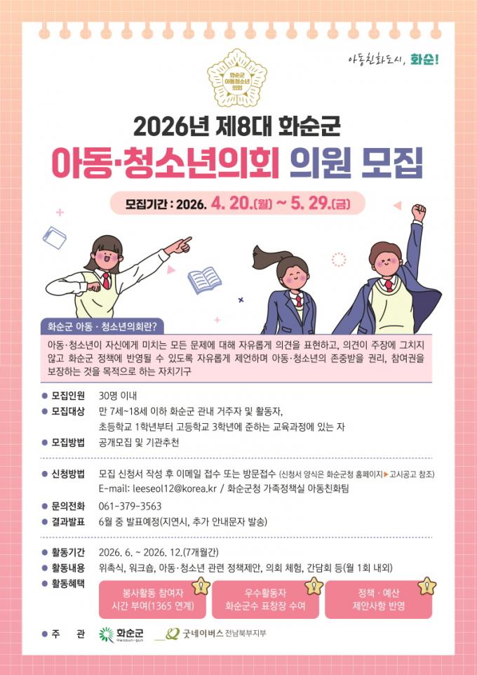 [È£³²µµ¹Î½Å¹® = ÀÓÀ±Áø ±âÀÚ] È­¼ø±º(±º¼ö ±¸º¹±Ô)Àº ¡®2026³â Á¦8´ë È­¼ø±º ¾Æµ¿¡¤Ã»¼Ò³âÀÇȸ¡¯ ÀÇ¿ø 30¸íÀ» ¿À´Â 4¿ù 20ÀϺÎÅÍ 5¿ù 29ÀϱîÁö °ø°³ ¸ðÁýÇÑ´Ù°í ¹àÇû´Ù.