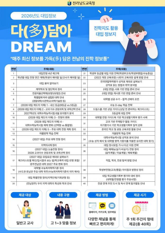 Àü¶ó³²µµ±³À°Ã»Àº ¿¬°£ 40ȸ ÀÌ»óÀÇ Á¤º¸Áö ¹ß°£À» ÅëÇØ Áö¼ÓÀûÀÎ ÁøÇÐÁ¤º¸ Áö¿ø ü°è¸¦ ±¸ÃàÇÒ °èȹÀÌ´Ù. À̸¦ ÅëÇØ ±³»çÀÇ ¾÷¹« ºÎ´ãÀ» °æ°¨Çϰí, Çлý¿¡°Ô º¸´Ù Á¤È®ÇÏ°í ½Å·Úµµ ³ôÀº ÀԽà Á¤º¸¸¦ Á¦°øÇÔÀ¸·Î½á ÁøÇÐ ¼º°ú Çâ»ó¿¡ ±â¿©ÇÒ °ÍÀ¸·Î ±â´ëµÈ´Ù.