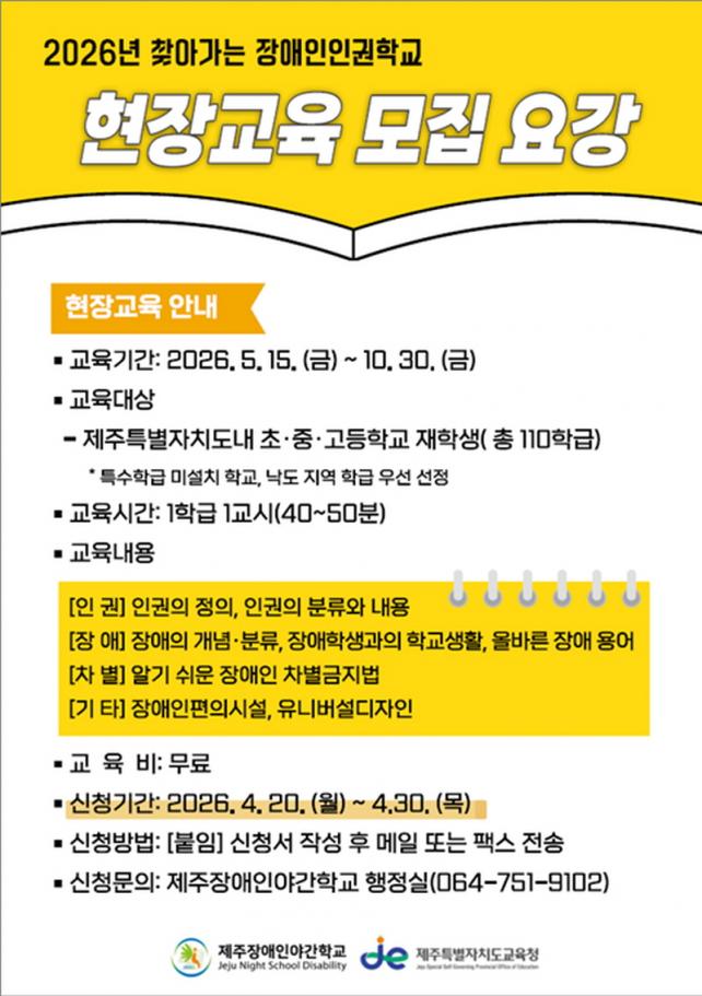 ½Åû ±â°£Àº 4¿ù 20ÀÏ(¿ù)ºÎÅÍ 30ÀÏ(¸ñ)±îÁö·Î, Á¦ÁÖÀå¾ÖÀξ߰£Çб³ ȨÆäÀÌÁö(http://cafe.daum.net/jejunightschool)¿¡ °Ô½ÃµÈ ½Åû¼¸¦ ÀÛ¼ºÇØ À̸ÞÀÏ ¶Ç´Â ÆÑ½º·Î Á¦ÃâÇÏ¸é µÈ´Ù. °ü·Ã ¹®ÀÇ´Â ÀüÈ(064-751-9102)¸¦ ÅëÇØ °¡´ÉÇÏ´Ù.
