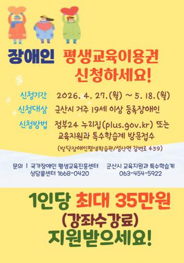 [È£³²µµ¹Î½Å¹® = ÀÓÀ±Áø ±âÀÚ] ±º»ê½Ã´Â ÇнÀ Ãë¾à°èÃþÀÇ ±³À° ±âȸ¸¦ ³ÐÈ÷°í ÀھƽÇÇöÀ» Áö¿øÇϱâ À§ÇØ, °ü³» 19¼¼ ÀÌ»ó µî·Ï Àå¾ÖÀÎÀ» ´ë»óÀ¸·Î ¿¬ 35¸¸ ¿ø »ó´çÀÇ Æò»ý±³À° ÀÌ¿ë±ÇÀ» Áö¿øÇÑ´Ù°í 23ÀÏ ¹àÇû´Ù.