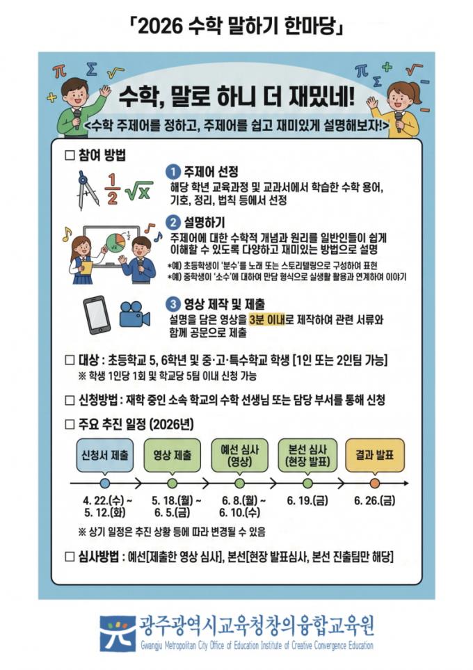 À̹ø Çà»ç´Â ±¤ÁÖ ¼öÇб³À° ´ëÇ¥ Á¤Ã¥ ¡®¼öÇÐÀ̿´Ù(onÒý)¡¯ÀÇ Çϳª·Î ¸¶·ÃµÆ´Ù. ´ë»óÀº ±¤ÁÖ ÃʵîÇб³ 5¡¤6Çгâ°ú Áß¡¤°í¡¤Æ¯¼öÇб³ ÇлýÀÌ´Ù.