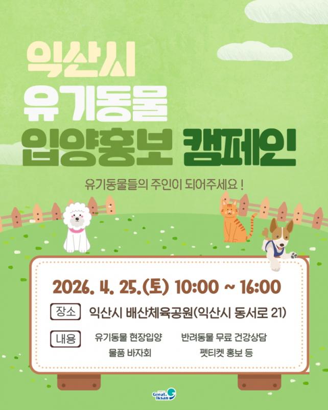 ¶ÇÇÑ, ÀÔ¾ç Àå·Á Áö¿ø Á¤Ã¥µµ ÇÔ²² È«º¸ÇÑ´Ù. ÀÍ»ê½Ã À¯±âµ¿¹°º¸È£¼¾ÅÍ¿¡¼ ÀÔ¾çÇÑ µÚ 1³â À̳» Áø·áºñ¡¤¿¹¹æÁ¢Á¾ µîÀ¸·Î 25¸¸ ¿ø ÀÌ»ó ÁöÃâÇÑ °æ¿ì ¿µ¼öÁõ, ³»ÀåÇü µ¿¹°µî·ÏÁõ, ÀÔ¾ç Àü ±³À° ¼ö·áÁõ µîÀ» Á¦ÃâÇϸé ÃÖ´ë 15¸¸ ¿øÀÇ ÀÔ¾çºñ¸¦ Áö¿ø¹ÞÀ» ¼ö ÀÖ´Ù.